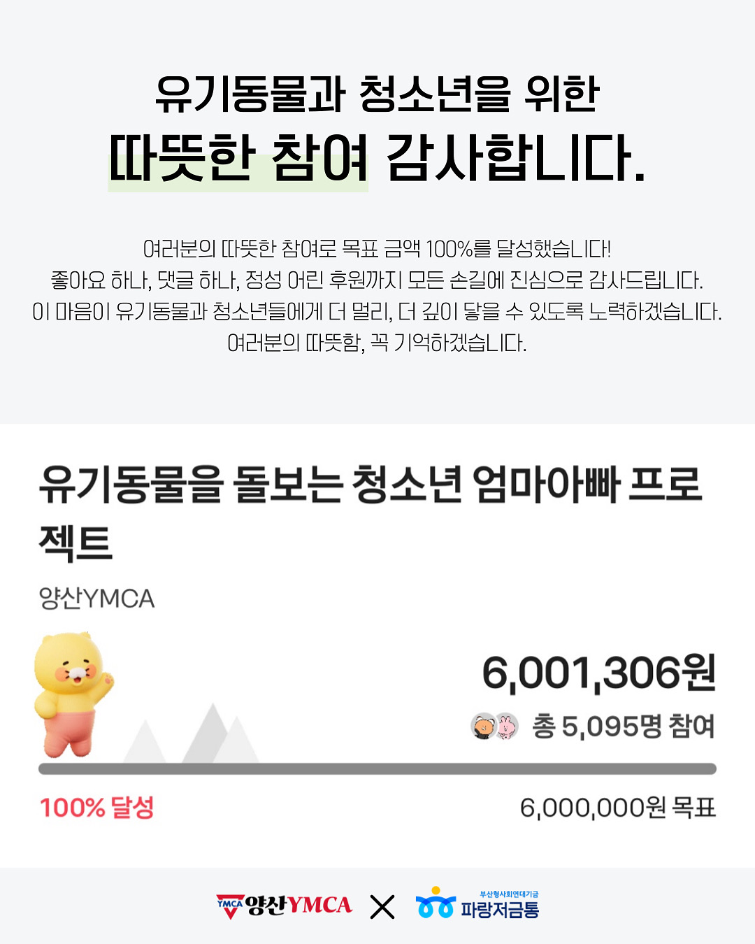 그리고 한 달 동안 진행했던 청소년 & 유기동물 모금 캠페인이 목표금액 100% 달성이라는 놀라운 결과를 이루었습니다💌 여러분의 따뜻한 마음이 모여 유기동물들에게는 희망의 밥그릇🍲을, 청소년들에게는 봉사와 배움의 기회📚를 선물했습니다.