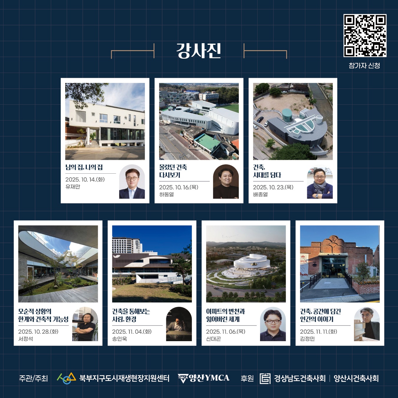 양산YMCA가 북구지구도시재생현장지원센터와 함께 퇴근길 건축 인문학을 엽니다. 가을의 한 가운데, 경남의 대표 건축사 일곱 분이 각각의 매력으로 건축 속에 담아낸 이야기들을 들려줍니다.