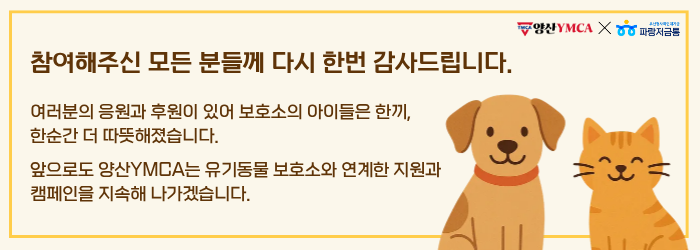 앞으로도 양산YMCA는 유기동물 보호소와 연계한 지원과 캠페인을 지속해 나가겠습니다💚
