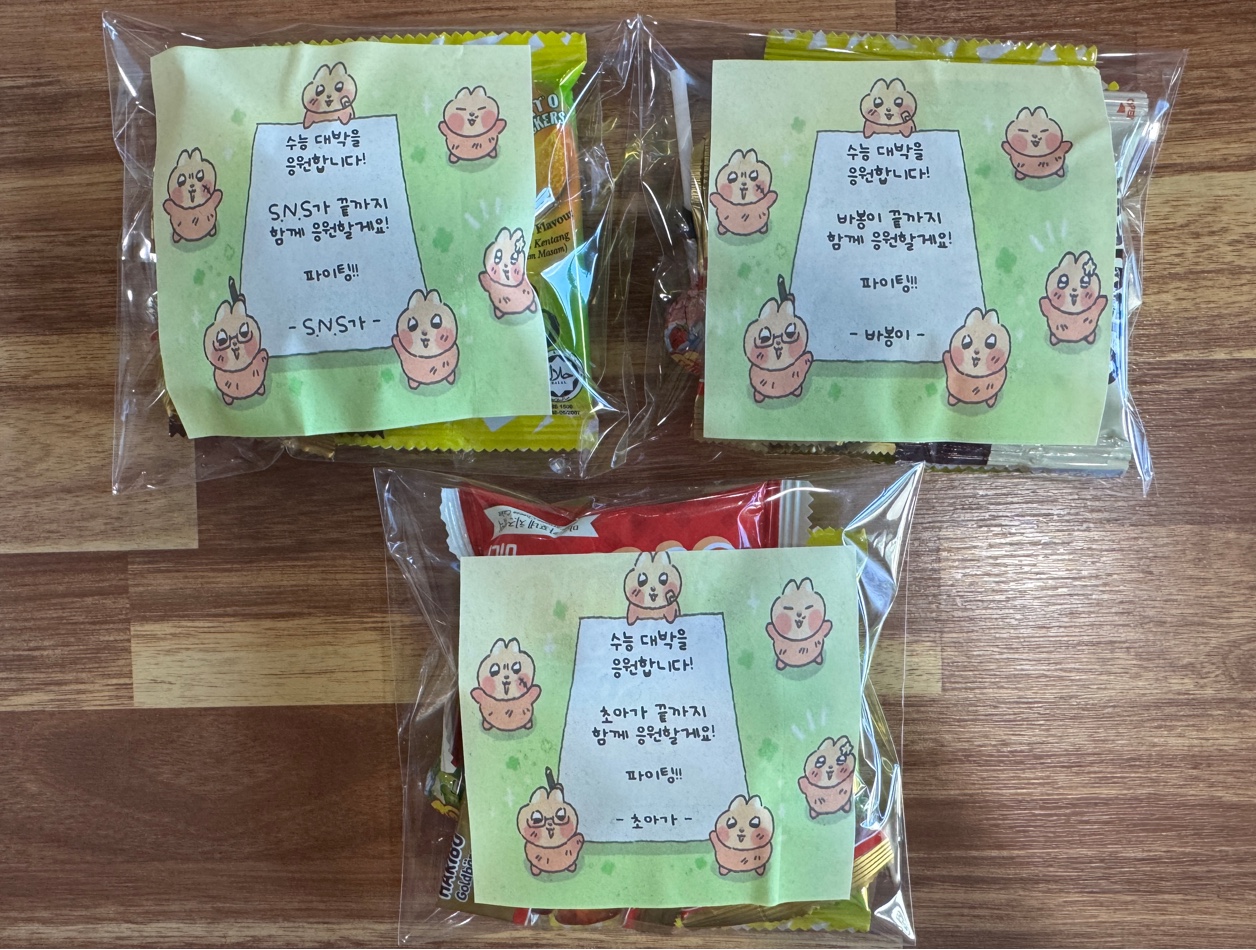 각 동아리의 손길이 담긴 포장지는 보는 사람의 마음까지 따뜻하게 했습니다. 작은 카드에 적힌 한 줄이 얼마나 큰 힘이 될지 상상하니 덩달아 응원하게 되네요!!