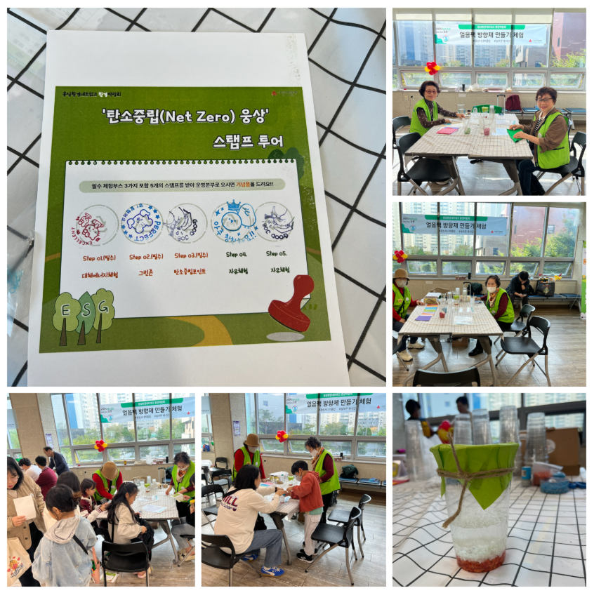 폐플라스틱으로 만든 정크아트 전시를 비롯 자전거 발전 체험을 통해 대체에너지를 체험하고, 폐플라스틱 플레이크로 키링을 만드는 그린존 체험, 탄소중립 실천을 약속하는 탄소중립포인트존, 그리고 업사이클링 체험을 진행할 수 있는 자유체험존으로 구성이 되어 진행되었습니다. 웅상시니어클럽은 늘푸른봉사단과 함께 자원재활용 지원봉사사업 참여자들이 수거한 아이스팩을 활용해 방향제를 만들어보는 체험부스를 운영했습니다.